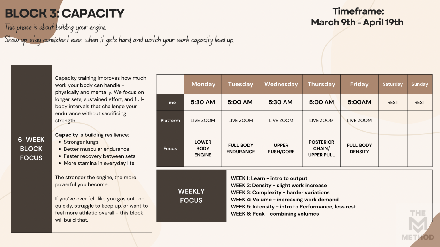Many programs continuously do random exercises. Your body doesn’t change from chaos – it changes from repeated, intentional stress followed by recovery. Block training means we commit to a specific focus for a set period of time (6 weeks), so your body has enough exposure to certain movements to actually adapt, grow & CHANGE your body.